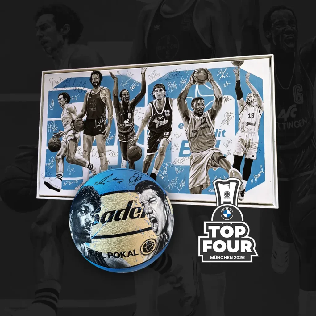 Zwei Unikate, unzählige Legenden: Zum 60-jährigen Jubiläum der easyCredit BBL versteigern wir eine von zahlreichen Basketball-Legenden signierte Kunst-Leinwand sowie einen von den vier aktuellen Kapitänen handsignierten BMW TOP FOUR-Spielball – zugunsten krebskranker Kinder und ihrer Familien.