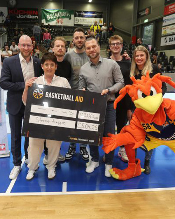 Die Fraport AG, damals noch Hauptsponsor der FRAPORT SKYLINERS aus Frankfurt, und wir spendeten in der Saison 2023/2024 pro erfolgreichem Dreier bei Liga-Heimspielen der SKYLINERS jeweils 50 Euro, insgesamt also 100 Euro an die Hilfe für krebskranke Kinder Frankfurt e. V.! Wir sagen herzlichen Dank für die tolle Unterstützung und gratulieren den SKYLINERS zum Aufstieg in die easyCredit BBL.